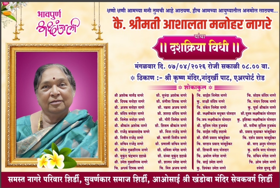 जीवनाच्या प्रदीर्घ प्रवासात मायेचा ओलावा, संस्कारांची श्रीमंती आणि प्रेमाचा अखंड झरा जपणारे व्यक्तिमत्त्व हरपणे ही कोणत्याही कुटुंबासाठी अतिशय वेदनादायक घटना असते. शिर्डी येथील नागरे परिवारावर अशीच एक दुःखद घटना ओढवली असून, कुटुंबातील जेष्ठ व अत्यंत आदरणीय व्यक्तिमत्त्व श्रीमती आशालता मनोहर नागरे (वय ७४) यांचे दि. २९ मार्च २०२६ रोजी अल्पशा आजाराने दुःखद निधन झाले. त्यांच्या निधनाने नागरे परिवारासह संपूर्ण परिसरात शोककळा पसरली आहे.