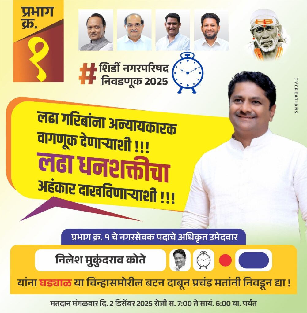 शिर्डी प्रतिनिधी — शिर्डी नगरपरिषद निवडणूक 2025 च्या रणधुमाळीला वेग आला असताना प्रभाग क्र. 1 मध्ये घड्याळ चिन्हाचे अधिकृत उमेदवार निलेश मुकुंदराव कोते हे जनतेच्या अपेक्षांचे नवे प्रतीक ठरत आहेत.
