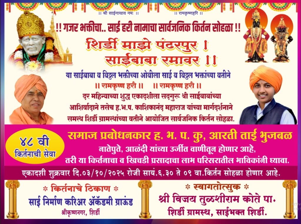 शिर्डी (दि. २) – साईनगरी शिर्डी ही नेहमीच भक्तिभाव, अध्यात्म आणि समाजप्रबोधनाचा संगम राहिलेली आहे. याच भूमीवर गेल्या ४७ महिन्यांपासून मोठ्या एकादशी निमित्ताने आयोजित करण्यात येणाऱ्या सार्वजनिक साई हरी कीर्तन सोहळ्याला आता चौथ्या पर्वाची सुरुवात होत आहे. येत्या शुक्रवारी, दि. ३ ऑक्टोबर २०२५ रोजी सायंकाळी ६.३० ते रात्री ९.३० या वेळेत शिर्डीतील साई निर्माण करिअर अकॅडमी, नांदुर्खी रोड येथे ४८ वा अखंड हरिनामाचा गजर रंगणार आहे.
