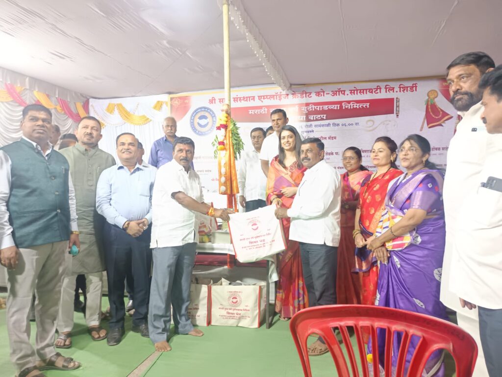 गुढीपाडवा निमित्त साई एम्प्लॉईज सोसायटीच्या वतीने आयोजित शिधावाटप कार्यक्रमात धनश्री विखे, नगराध्यक्ष जयश्री थोरात, उपनगराध्यक्ष अभय शेळके, रामनवमी उत्सव समितीचे अध्यक्ष संजय शिंदे, उपमुख्य कार्यकारी अधिकारी भीमराज दराडे, चेअरमन विठ्ठल पवार आदी उपस्थित.