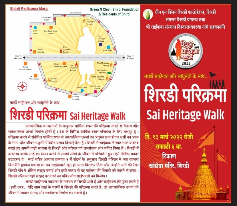 साईबाबांच्या पवित्र नगरीत ग्रीन एन क्लिन शिरडी फाऊंडेशनच्या पुढाकारातून व शिरडी ग्रामस्थांच्या सक्रीय सहभागातून सुरू झालेल्या “शिरडी परिक्रमा” या अनोख्या उपक्रमाचे यंदा ६वे वर्ष भव्य साजरे होत आहे. सर्वधर्मीय संत, विविध सामाजिक संस्था, स्थानिक पदाधिकारी, ग्रामस्थ व देशभरातून येणाऱ्या हजारो साईभक्तांच्या उपस्थितीत मंगळवार दि. १३ फेब्रुवारी २०२४ रोजी सकाळी ५.३० वाजता श्री खंडोबा मंदिरातून परिक्रमेचा शुभारंभ होणार आहे.