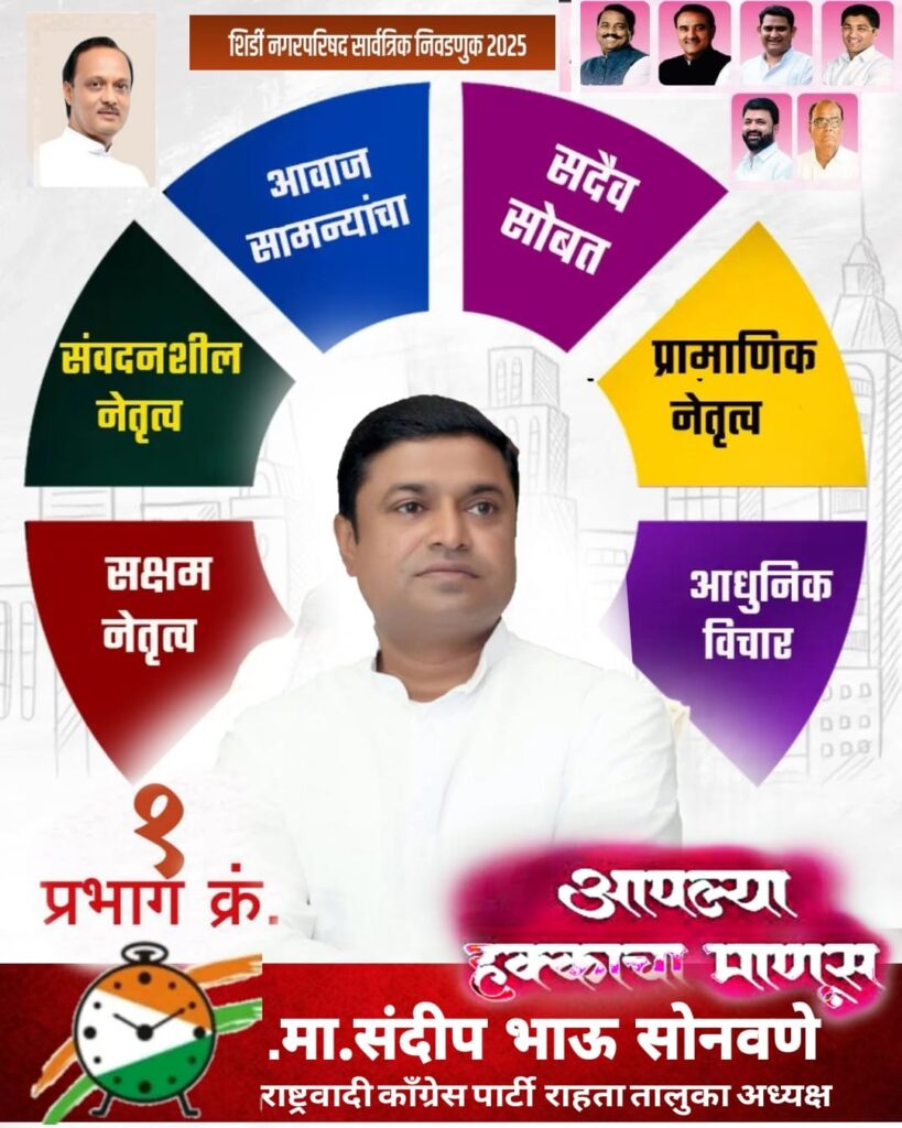 शिर्डी नगरपरिषद सार्वत्रिक निवडणुकीची घोषणा झाल्यानंतर शहरातील राजकीय वातावरण दिवसेंदिवस तापू लागले आहे. विशेषतः प्रभाग क्रमांक १ मध्ये राष्ट्रवादी काँग्रेस पक्षाचे राहाता तालुका अध्यक्ष मा. संदीप भाऊ सोनवणे यांच्या संभाव्य उमेदवारीची चर्चा जोरदार रंगू लागली आहे.
